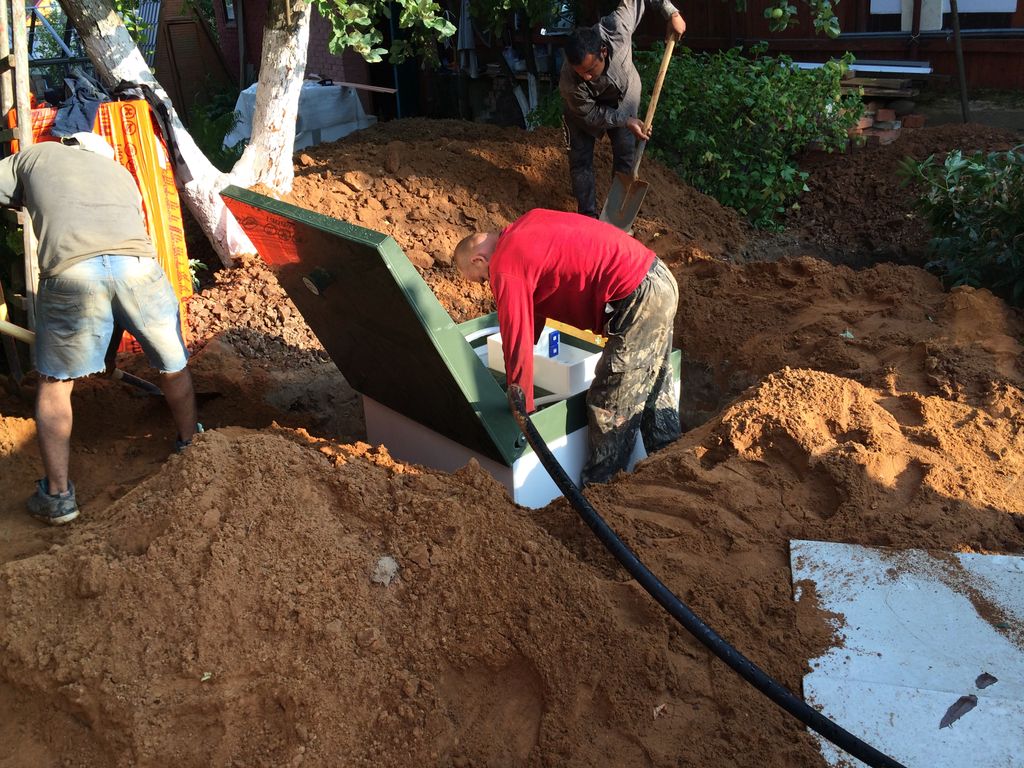 Погружение станции в котлован и засыпка песком. Врезка и впайка канализационных труб. Подключение компрессоров и насосов.